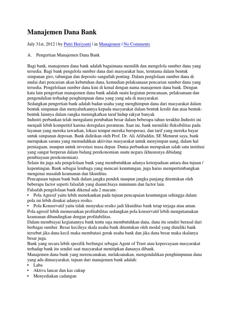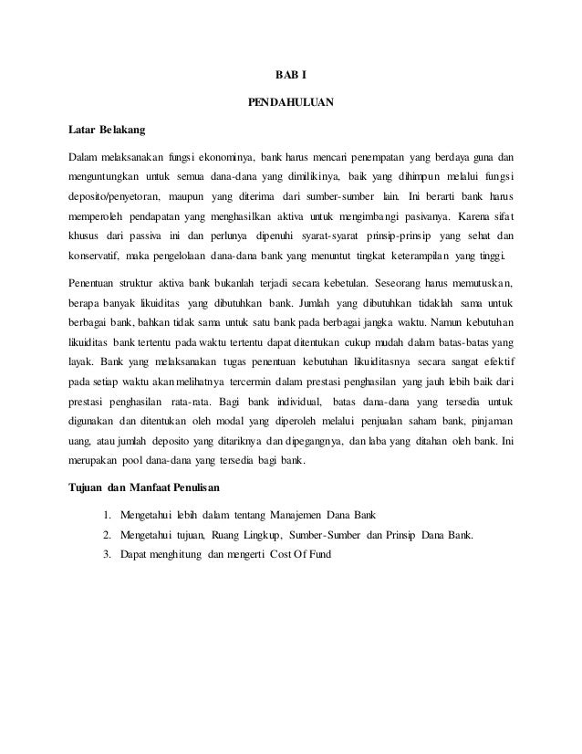 Mengetahui lebih dalam tentang Manajemen Dana Bank 2. Mengetahui tujuan, Ruang Lingkup, Sumber-Sumber dan Prinsip Dana Bank. 3. Dapat menghitung dan mengerti Cost Of Fund 4. BAB II PEMBAHASAN Pengertian Manajemen Dana Bank Kegiatan utama bank adalah mengumpulkan dana dan menyalurkan kredit yang harus dilakukan dengan baik dan benar.