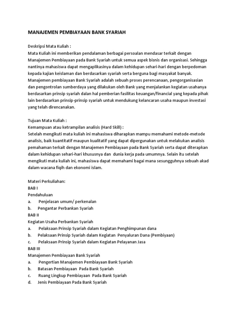 Manajemen Keuangan Syariah: Definisi, Ruang Lingkup, dan Sejarahnya. Manajemen keuangan merupakan sebuah aktivitas mengelola dana yang dimiliki oleh pribadi maupun bisnis tertentu yang meliputi pembuatan anggaran, perencanaan, pemeriksaan hingga penyimpanan yang bertujuan untuk memastikan bahwa arus kasnya berjalan dengan baik. MANAJEMEN DANA BANK SYARIAH A. Pengertian Manajemen Dana Bank Syariah Manajemen dana bank sebagai suatu proses pengelolaan penghimpunan dana-dana dari masyarakat ke dalam bank dan pengalokasian dana-dana tersebut bagi kepentingan bank dan masyarakat serta pemupukannya secara optimal melalui pergerakan semua sumber daya yang tersedia demi mencapai tingkat rentabilitas yang memadai sesuai dengan ... BAB 3 MANAJEMEN DANA PERBANKAN 30 A. Pengertian Sumber dana 31 B. Sumber dana bank 32 ... oleh bank syariah seperti Bank Muamalat Indonesia dan BPR Syariah lainnya. Dewasa ini, sesuai dengan undang-undang perbankan nomor 10 tahun 1998, bank umum pun dapat ... 4. Manajemen dana bank syariah 5. Manajemen permodalan bank syariah 6. Manajemen likuiditas perbankan syariah 7. Kualitas aktiva produktif dan penyisihan penghapusan aktiva produktif bagi bank syariah 8. Manajemen aktiva dan liabilitas pada bank syariah 9. Analisis laporan keuangan, efisiensi produksi dan kesehatan bank syariah 10. Manajemen ...