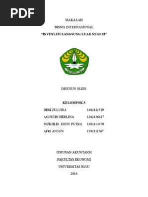 MAKALAH INVESTASI SOFTSKILLS. INVESTASI ATAU PENANAMAN MODAL. NAMA ANGGOTA : 1. ... untuk memberikan persetujuan dan ijin atas investasi langsung luar negeri. Masuknya perusahaan asing dalam kegiatan investasi di Indonesia dimaksudkan sebagai pelengkap untuk mengisi sektor-sektor usaha dan industri yang belum dapat dilaksanakan sepenuhnya oleh pihak swasta nasional. Modal asing juga diharapkan ... MAKALAH BISNIS INTERNASIONAL INVESTASI LANGSUNG LUAR NEGERI (FOREIGN DIRECT INVESMENT-FDI) Dosen Pengampu: Lalu Supardin, S.E., M.M Di Susun Oleh : Kelompok 5 1. Putra Geovani Koroh 2018008491 2. Betti Novian 2018008454 3.