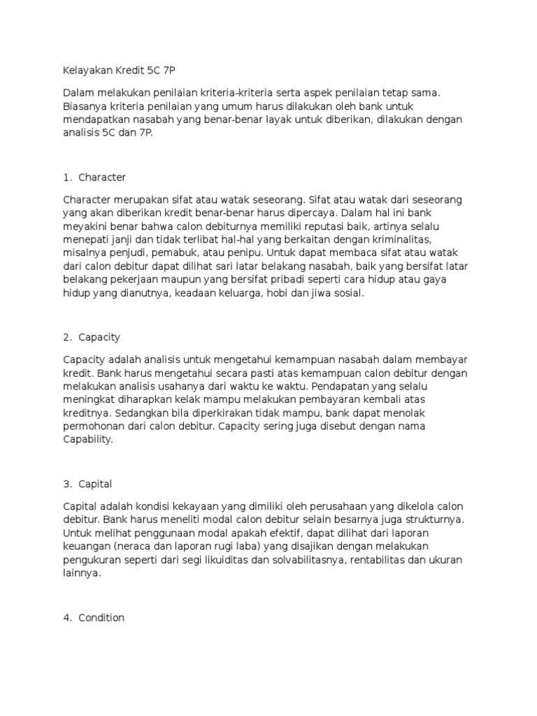 Prinsip Pemberian Kredit 7P Selain prinsip 5C, prinsip lainnya yang digunakan oleh lembaga keuangan dalam memberikan kredit adalah prinsip 7P. Dalam prinsip ini terdapat tujuh kriteria yang harus dipenuhi, yaitu: 1. Personality Kriteria pertama adalah personality, yaitu kepribadian dari calon peminjam yang mengajukan kreditnya. May 03, 2020 · Analisis Pemberian Kredit Bank: Pengertian Prinsip 5C 7P 3R Jenis Contoh. Pengertian Analisis Kredit. Sebelum permintaan kredit nasabah disetujui oleh bank, bank harus yakin bahwa kredit yang diberikan akan benar- benar dapat kembali. Keyakinan tersebut diperoleh dari hasil analisis penilaian kredit sebelum kredit tersebut disalurkan. Prinsip 5C adalah yang pertama dijadikan acuan dalam pemberian kredit kepada nasabah, prinsip ini terdiri dari lima kriteria yang harus dipenuhi oleh pengaju kredit, yaitu: Character Kriteria yang pertama adalah character, yaitu melihat bagaimana karakter dan latar belakang calon peminjam atau nasabah yang mengajukan kredit. Analisis 5c dan 7p dalam penilaian kredit perbankan. Suatu tempat walaupun nya layak kredit macet mirip di lain pihak penyaluran kredit mengandung resiko bisnis terbesar dalam dunia perbankan tentang kredit. Di artikel ini kita akan bahas. Dalam melakukan analisa kredit bank harus memperhatikan prinsip analisa kredit yaitu analisa 7c analisa ...