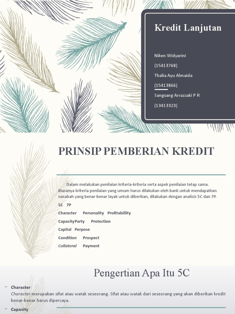 Pemberian kreditnya bank harus memerhatikan prinsip-prinsip. nemberian kredit yang benar. Ada beberapa prinsip-prinsip penilaian kredit yang sering dilakukan yaitu dengan analisis 5C, analisis 7P dan studi kelayakan. Kedua prinsip ini, 5C dan 7P memiliki persamaan, yaitu apa-apa yang terkandung dalam 5C dirinci lebih lanjut dalam prinsip 7P dan ...