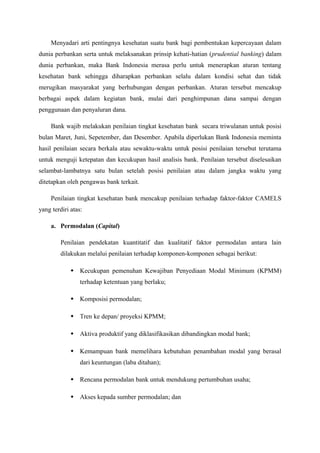 Makalah kesehatan dan rahasia bank. 1. Kesehatan dan rahasia bank. 2. M. NUR BAGASKARA F. (17080694015) ANNISA WASISTIANA (17080694016) RIZA QUR'ANIZA PUTRI (17080694023) IDA SHOLICHATUNNISA'. 3. Kesehatan bank Kemampuan bank dalam memenuhi semua kewajibannya sesuai peraturan dan menjalankan kegiatan operasional secara normal. 4. BAB I a. Latar Belakang Pembuatan makalah ini di dasari oleh tugas yang telah diberikan oleh Dosen untuk menulis mengenai Rahasia Bank dan Tindak Pidana Perbankan. Mengenai Rahasia Bank dan Tindak Pidana Perbankan sangat perlu kita pahami agar kita mengerti secara rinci mengenai hak dan kewajiban dari pihak Bank dan Nasabah di dalam dunia Perbankan. Dan Jika ada terjadi pelanggaran di antara ... KESEHATAN DAN RAHASIA BANK MAKALAH BANK DAN LEMBAGA KEUANGAN LAINNYA Ditujukan Kepada Dosen Pengampu Mata Kuliah Bank dan Lembaga Keuangan Lainnya Ibu Amanita Novi Yushita, SE dan Rr. Indah Mustikawati, M.Si,Ak. Aturan Kesehatan Bank •Berdasarkan UU no. 10 thn 1998 tentang perbankan, pembinaan dan pengawasan bank dilakukan oleh Bank Indonesia. •Kesehatan suatu bank sangat penting bagi pembentukan kepercayaan dalam dunia perbankan serta untuk melaksanakan prinsip kehati-hatian (prudential banking) dalam dunia perbankan.