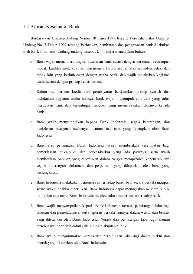 Maka Kesehatan Bank merupakan tolok ukur bagi manajemen untuk menilai apakah pengelolaan bank dilakukan sejalan dengan azas-azas perbankan yang sehat dan sesuai dengan ketentuan yang berlaku. Tujuan dari tolok ukur tersebut untuk menetapkan arah pembinaan dan pengembangan bank baik secara individual maupun perbankan secara keseluruhan BAB II MAKALAH LEMABAGA KEUANGAN "Kesehatan dan Rahasia Bank" Disusun Oleh: Eliana Pengertian Kesehatan bank menurut Bank Indonesia sesuai denganUndang- undang RI No. 7 Tahun 1992 Tentang perbankan Pasal 29 adalah Bank dikatakan sehat apabila bank tersebut memenuhi ketentuan Kesehatan bank dengan memperhatikan aspek Permodalan, Kualitas Asset ... 3.1 KESEHATAN BANK 3.1.1 Pengertian. Kesehatan bank dapat diartikan sebagai kemampuan suatu bank untuk melakukan kegiatan operasional perbankan secara normal dan mampu memenuhi semua kewajibannya dengan baik dengan cara-cara yang sesuai dengan peraturan perbankan yang berlaku. Pengertian tentang kesehatan bank di atas merupakan suatu batasan yang sangat luas, karena kesehatan bank memang ... A. Contoh Landasan Teori Makalah. Makalah adalah karya tulis ilmiah yang mewajibkan penulisnya untuk menyertakan teori dalam pengembangan pemikiran penulis dalam karya tulis ilmiah tersebut. Menurut karya tulis ilmiah, makalah, landasan teori berada dalam Bab II. Berikut adalah contoh dari landasan teori untuk karya tulis ilmiah makalah.