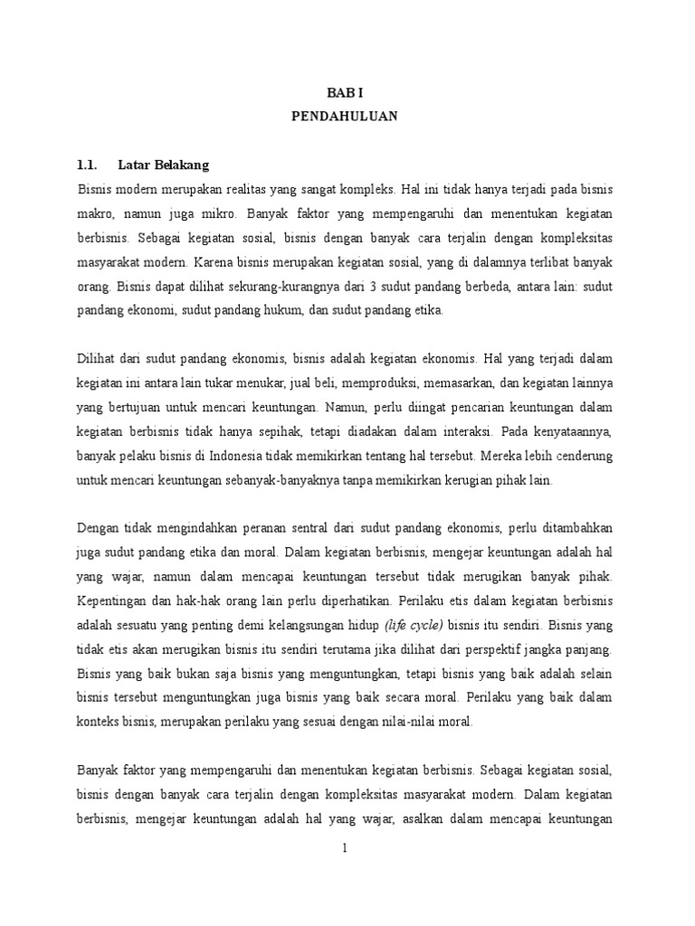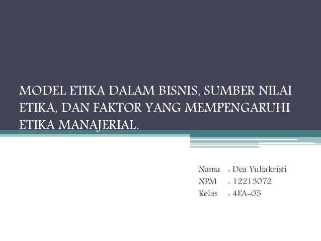 Bisnis Dan Etika Dalam Dunia Modern 1.Tiga Aspek Pokok Dari Bisnis Bisnis modern merupakan realitas yang amat kompleks. Banyak faktor yang turut mempengaruhi dan menentukan kegiatan bisnis. Faktor-faktor Yang Mempengaruhi Etika Bisnis Faktor Leadership Dalam Bisnis. Kepemimpinan yang beretika menggabungkan antara pengambilan keputusan yang beretika dan perilaku yang beretika. Tanggung jawab utama dari seorang pemimpin adalah membuat keputusan yang beretika dan berperilaku yang beretika pula. Ada beberapa hal yang harus dilakukang ... Dalam makalah ini membahas mengenai bagaimana seharusnya perilaku etika dalam berbisnis. Menjelaskan pula mengenai lingkungan bisnis yang mempengaruhi perilaku ... Berita-berita mengenai pelanggaran etika bisnis mendorong ketertarikan untuk Pakar kesehatan menyebutkan bahwa menelusuri lebih lanjut faktor-faktor yang telur yang sudah retak menjadi media mendorong dan dampak yang diakibatkan. tumbuhnya bakteri, salah satunya salmonella Etika bisnis merupakan aspek moral dalam (doktersehat.com).