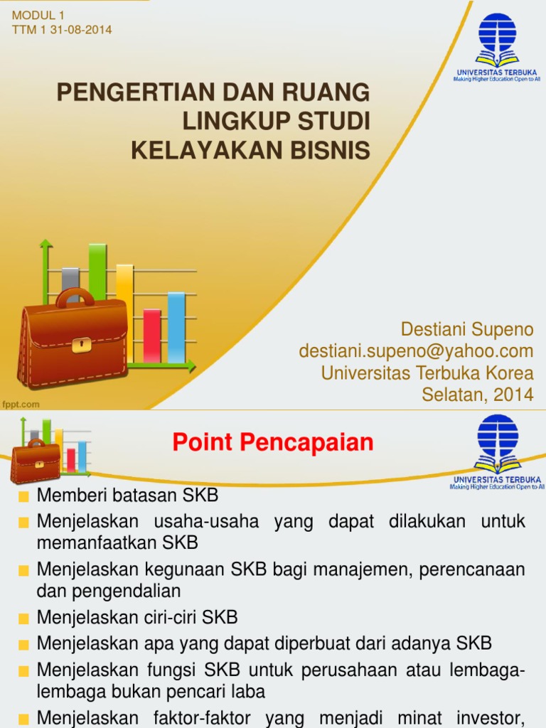 EKMA4311 - Studi Kelayakan Bisnis. Mata kuliah ini membahas tentang penelitian tentang layak tidaknya suatu rencana dan operasional suatu bisnis tertentu dalam mencapai keuntungan maksimal dalam waktu yang tidak ditentukan. Penelitian kelayakan tersebut menyangkut berbagai aspek yang meliputi baik aspek hukum, sosial, ekonomi, budaya, pasar ... Studi Kelayakan Bisnis - Pengertian, Manfaat, Aspek, Materi, Tahapan, Contoh : Suatu kegiatan yang mempelajari secara mendalam tentang suatu kegiatan atau usaha yang akan dijalankan, untuk menentukan layak atau tidaknya suatu bisnis dijalankan.tujuan utama dilakukan studi kelaykan bisnis ini tentunya yang akan berdiri bisa berjalan sesuai harapan baik dalam jangka pendek atau panjang. B. Studi Kelayakan Bisnis Studi kelayakan bisnis merupakan kegiatan mempelajari suatu rencana investasi untuk menentukan layak tidaknya rencana investasi tersebut dijalankan. Secara singkat dapat di artikan bahwa studi kelayakan bisnis menjembatani antara planning dan doing. C. Studi Kelayakan Bisnis UKM - Selamat datang di Toko Buku Online Deepublish, pada kesempatan kali ini kami akan share tentang sebuah artikel dengan tema studi kelayakan bisnis ukm.Mengapa ukm perlu dilakukan studi kelayakan? Itulah yang akan kita jawab dalam bahasan singkat di bawah ini : Tantangan Yang Dihadapi Usaha Kecil Menengah
