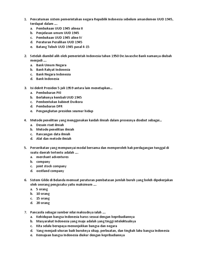 Soal CPNS Dan Kunci Jawaban 2019 a. mengubah lambang visual (katon) menjadi lambang bunyi b. mengubah kode-kode atau lambang-lambang verbal menjadi bunyi-bunyi bahasa yang dapat 16. Setelah diambil alih oleh pemerintah Indonesia tahun 1950 De Javasche Bank namanya diubah menjadi …. a. Bank Umum Negara b... Perekonomian Indonesia pada masa Demokrasi Liberal - Donisaurus Perubahan mengenai nasionalisasi De Javasche Bank menjadi Bank Indonesia sebagai bank sentral dan bank sirkulasi diumumkan pada tanggal 15 Desember 1951 berdasarkan Undang-undang No. 24 tahun 1951. Sistem Ekonomi Ali-Baba. 33 Software Analisa Kredit Gratis - Info Dana Tunai 25 Check Nama Blacklist Bank. 26 Tahun 1950 De Javasche Bank Namanya Diubah Menjadi. 22 Aplikasi Bisnis Online Gratis. 32 Gadai Sertifikat Rumah Perorangan. 29 Perkembangan Investasi Di Indonesia 5 Tahun Ter... 34 Pinjaman Pribadi Non Bank. 22 Studi Kasus Komunikasi Bisnis. Simulasi Tes CAT CPNS & PPPK Online 2021 | Info Pendidikan Tidak Menjawab 0 Poin (TWK dan TIU). Soal TKP jawaban berbobot 1 - 5 poin (Jawaban Terbaik 5 Poin). 7. Teman-teman juga bisa membandingkan nilai skor jawaban SOAL PERTANYAAN Setelah diambil alih oleh pemerintah Indonesia tahun 1950 De Javasche Bank namanya diubah menjadi ….