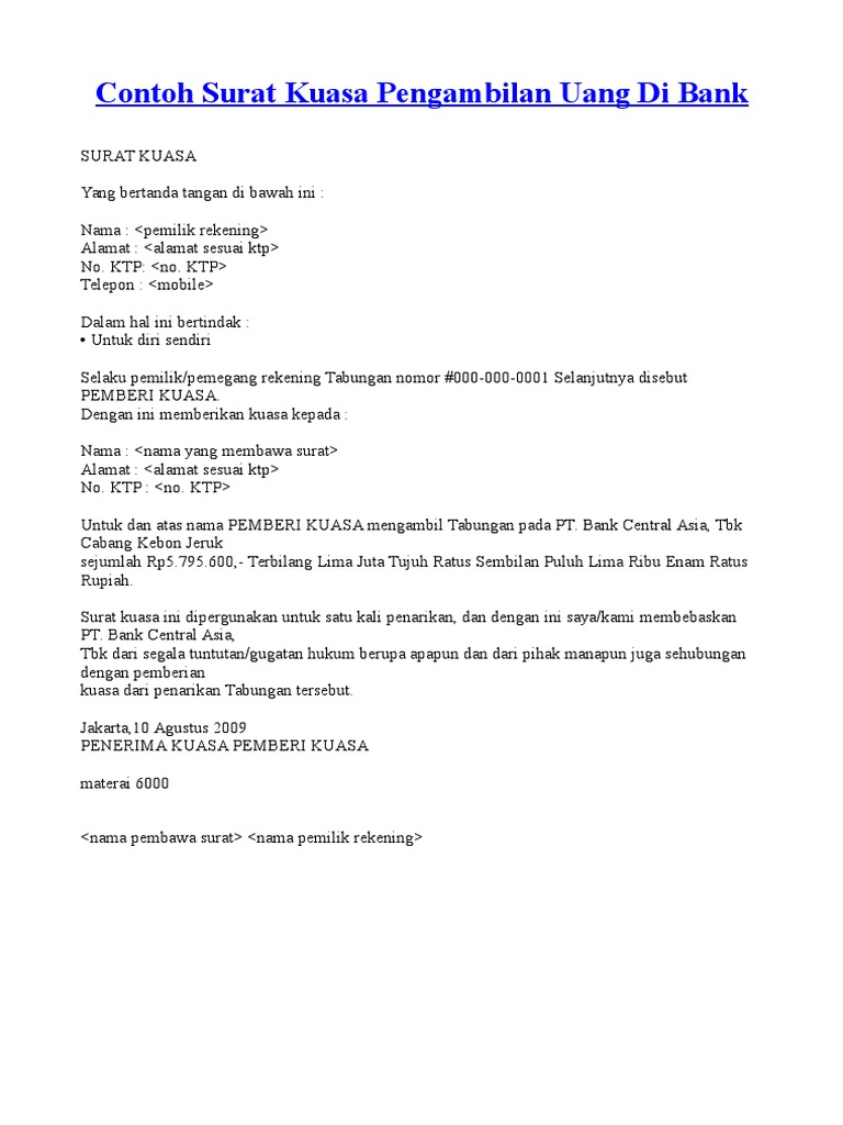 7 Contoh Surat Kuasa Pengambilan Uang di Bank Beserta ... Dalam surat kuasa, wajib mencantumkan apa tujuan dibuatnya surat kuasa tersebut. Misalnya untuk pengambilan uang, cetak rekening koran, hingga pembuatan rekening. 5. Tandatangan Bermaterai. Surat kuasa yang dibuat harus bisa dipertanggungjawabkan keabsahannya. Maka dari itu, surat kuasa ini wajib membubuhkan tandatangan di atas materai.