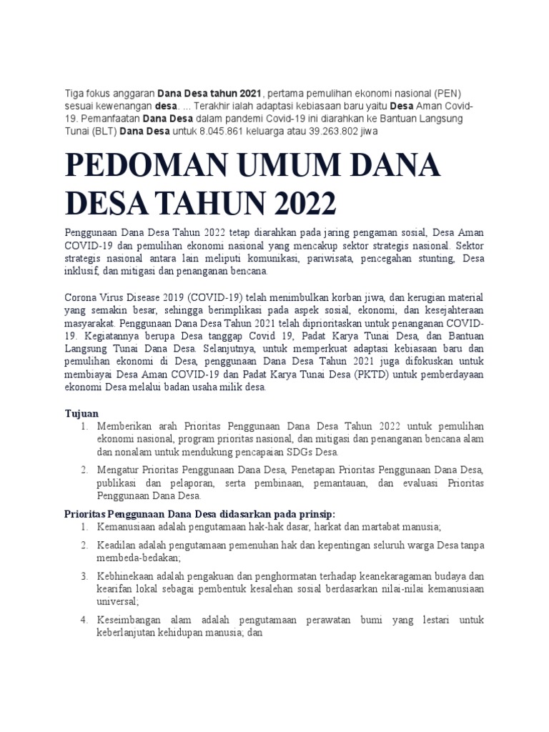 Peran Dana Desa dalam Pemulihan Ekonomi Nasional dan ... Prioritas utama penggunaan Dana Desa pada tahun ini adalah program perlindungan sosial berupa BLT Desa. BLT Desa merupakan pemberian uang tunai kepada keluarga miskin atau tidak mampu di desa yang bersumber dari Dana Desa. Pemberian ini bertujuan untuk membantu warga miskin desa, mengurangi dampak ekonomi akibat adanya pandemi Covid-19, serta ...
