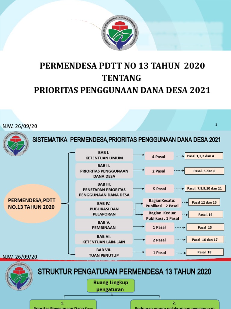 Prioritas Penggunaan Dana Desa 2021 - Sedesa.id Download PERMENDES Prioritas Penggunaan Dana Desa 2021. Secara lengkap mengenai prioritas penggunaan dana desa tahun 2021 telah diatur dalam Peraturan Menteri Desa, Pembangunan Daerah Tertinggal, Dan Transmigrasi Republik Indonesia Nomor 13 Tahun 2020. PERMENDES ini sebagai pedoman kita dalam membuat prioritas dari penggunaan dana desa.