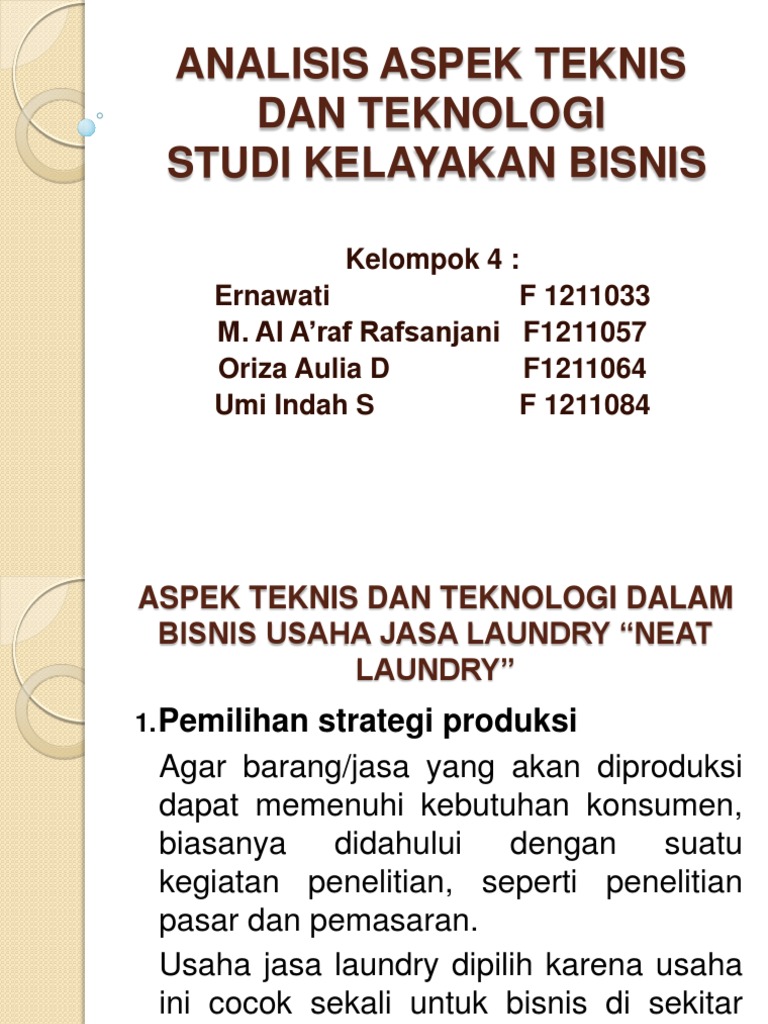 8 Aspek Studi Kelayakan Bisnis - Toilet Bisnis Aspek dalam studi kelayakan bisnis berkaitan atas rencana kualitas produk pemilihan strategi produksi, pemilihan teknologi, dan lain-lain. Di mana kesemuanya adalah elemen yang memiliki kaitan pada teknologi dan teknis yang dipakai oleh sebuah perusahaan. Maka dari itu aspek teknis dalam studi kelayakan bisnis sangatlah penting. Aspek manajemen