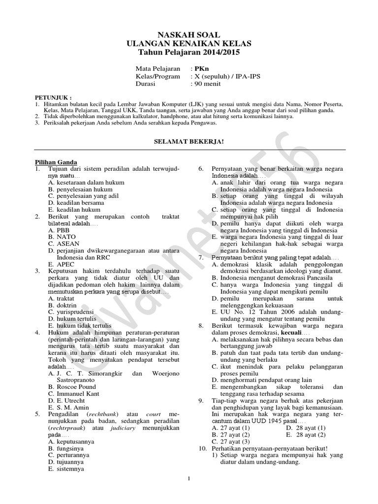 Soal PKn Kelas 10 (X) Tahun Ajaran 2022 SMA/MA/SMK Soal PKn Kelas 10. Artikel ini membahas tengang Soal PKn Kelas 10 untuk tahun ajaran 2020-2021 tingkat sekolah dasar SMA/SMK/MA pada mata pelajaran Pkn berdasarkan kurikulum terbaru. Pendidikan kewarganegaraan kelas 10 atau tingkat SMA/SMK/MA merupakan sebagai salah satu mata pelajaran yang ada di setiap sekolah negri ataupun swasta. Soal PKN Kelas 12 SMA/MA 2022 dan Kunci Jawabannya Soal PKN Kelas 12. By Guru Merry Posted on 15/01/2022. Soal PKN Kelas 12 SMA/MA - Kali ini majalahpendidikan.com akan menerangkan materi pelajaran dan latihan soal semester 1 dan semester 2, berupa soal pilihan ganda dan essay seperti, uas mid semester, dari kelas 1 sd sampai kelas 12 SMA beserta kunci jawaban dan pembahasannya lengkap.