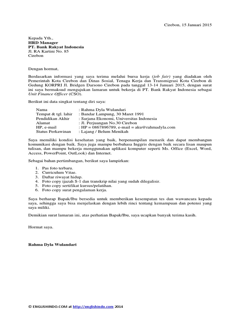 50+ Contoh Surat Lamaran Kerja yang Baik dan Benar (+File Doc) Berikut adalah contoh surat lamaran kerja di PT, Bank, Guru, Restoran, Akuntan, dll. 1. Fotocopy Ijazah terakhir. 2. Fotocopy Transcript Nilai. 3. Curriculum Vitae (CV). Contoh Surat Lamaran Kerja di Bank. Kepada Yth., HRD BANK [Nama BANK].