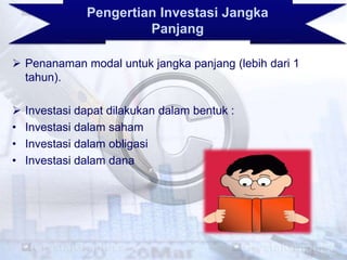 Contoh Investasi Jangka Pendek yang Aman dan Menguntungkan ... Investasi jangka panjang Sementara itu, investasi jangka panjang memiliki waktu lebih lama, yakni lebih dari 5 tahun. Investasi dengan horizon jangka panjang ini sangat cocok buat yang memiliki tujuan keuangan masa depan, seperti membeli rumah, biaya pendidikan anak, dana pensiun, dan lainnya.