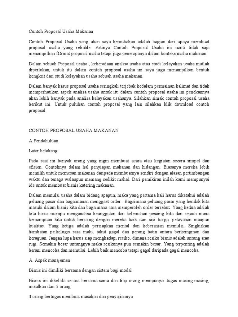 Contoh Proposal Bisnis Makanan Best Recipes 5+ contoh proposal bisnis plan untuk bisnis makanan - evanazka. 2020-08-18 Contoh Proposal Bisnis-Dalam mengajukan suatu ide bisnis kepada para calon investor, sahabat, ataupun kepada calon konsumen 2022-01-27 Contoh proposal studi kelayakan bisnis makanan. 8 Contoh Proposal Studi Kelayakan Bisnis - Galeri Proposal Study Kelayakan Bisnis adalah satu aktivitas yang sudah dilakukan untuk tentukan apa satu Untuk beberapa orang pemula atau pelaku bisnis, study Kelayakan Bisnis kemungkinan kedengar asing. 5 Contoh Proposal Kewirausahaan Makanan dan Minuman. 23 Contoh Kata Pengantar Proposal...