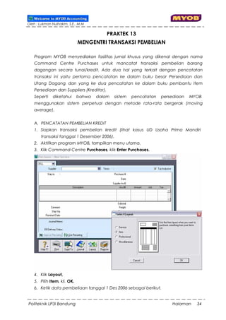 50 Soal Komputer Akuntansi MYOB Perusahaan Jasa ... - Muttaqin Jika menggunakan MYOB, maka langkah awal untuk mencatat transaksi tersebut yaitu melalui jendela … A. Banking > Spend Money B. Sales > Receive Payment C. Purchases > Pay Bills D. Sales > Enter Sales E. Banking > Receive Money 24. Langkah awal untuk mencatat transaksi pembelian secara kredit dalam MYOB yaitu … A. Banking > Receive Money