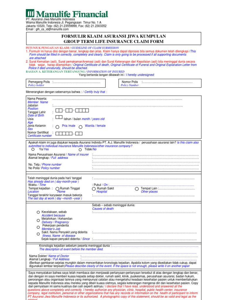 PDF PT Asuransi Jiwa Manulife Indonesia PT Asuransi Jiwa Manulife Indonesia Sampoerna Strategic Square / South Tower Jl. Jend. Sudirman Kav 45 - 46 Jakarta 12930 Indonesia T +62 21 2555 7788 ext. 641236 E prancis_m@manulife.com