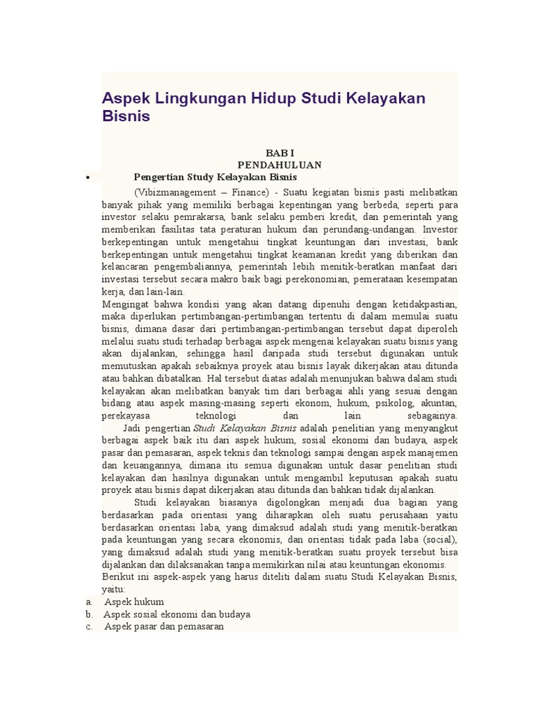 PEngaruh Aspek Lingkungan Pada Bisnis Anda - Pentingnya ... Dalam melakukan studi kelayakan bisnis banyak aspek yang harus ditinjau aspek manajemen atau organisasi, aspek ekonomi sosial, dan aspek Pentingnya Studi Kelayakan Budi Daya Kelautan Berkelanjutan Analisa yang masuk dalam aspek lingkungan ini, akan menjadi satu dalam suatu studi kelayakan bersama aspek ekonomi dan sosial untuk (Doc) Studi Kelayakan Bisnis Dalam Aspek Lingkungan ... STUDI KELAYAKAN BISNIS DALAM ASPEK LINGKUNGAN BAB I PENDAHULUAN A. Latar Belakang Perkembangan bisnis atau usaha pada saat ini telah menjadi suatu perkembangan yang sangat signifikan bagi Indonesia. Dari yang berwujud UMKM (Usaha Mikro Kecil Menengah) sampai dengan perusahaan-perusahaan besar.