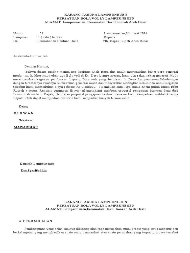 9 Contoh Proposal Kegiatan, Bantuan Dana... | Woazy.com woazy.com - Contoh proposal. Proposal lazimnya dikenal sebagai sebuah dokumen yang berisi rencana kegiatan yang terancang secara sistematis Contoh Proposal Bantuan Dana. Persatuan volley ball andes club jl. Wonosari No.71 Desa Bina Maju Kec. Rangsang Barat Kab.