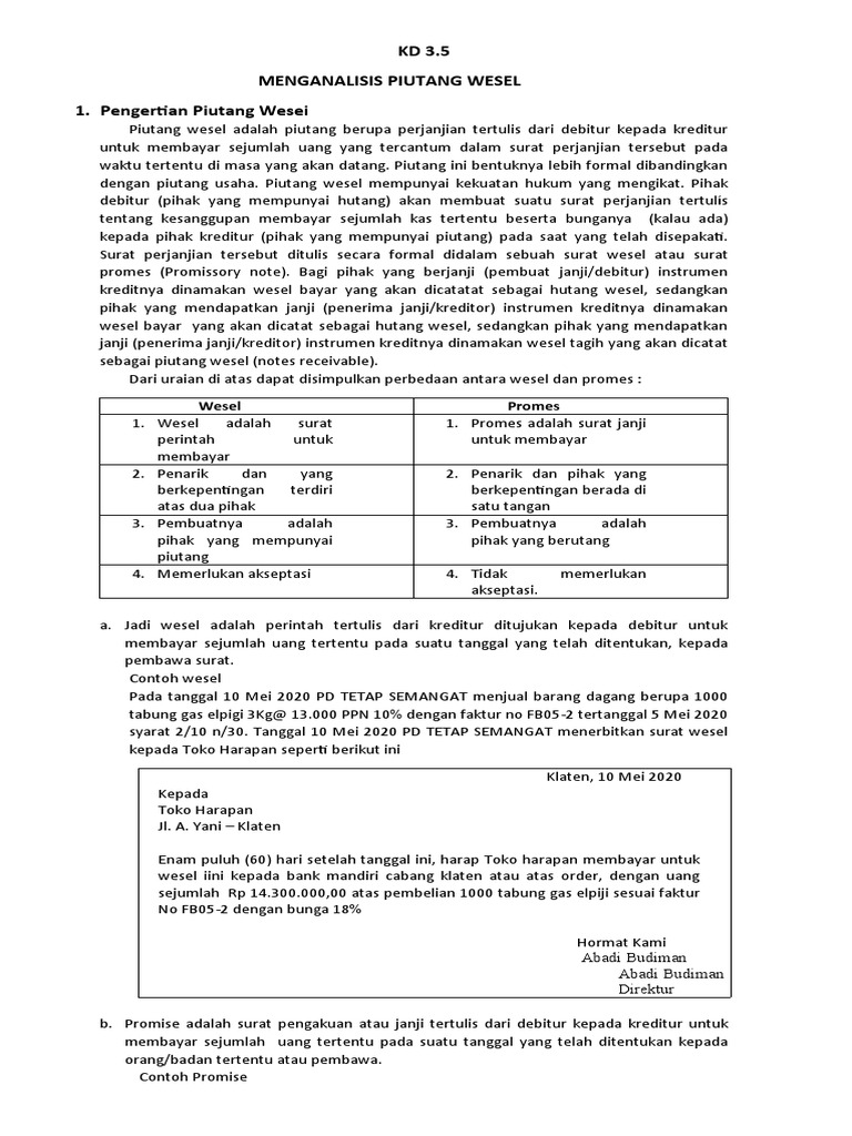 Meminjam uang ke bank dengan menggunakan wesel ... soal akuntansi keuangan kel 6.doc - Course Hero Meminjamkan uang ke bank dengan menggunakan wesel sebagai jaminan disebut ... A. piutang wesel B. wesel elsplisit C. wesel tanpa bunga D. piutang wesel berbunga E. mendiskontokan wesel 20. Bukti yang digunakan bagian jurnal untuk mencatat transaksi dengan mendebit retur penjualan dan mengkredit piutang dagang. Bukti sebagai dasar mutasi piutang ...
