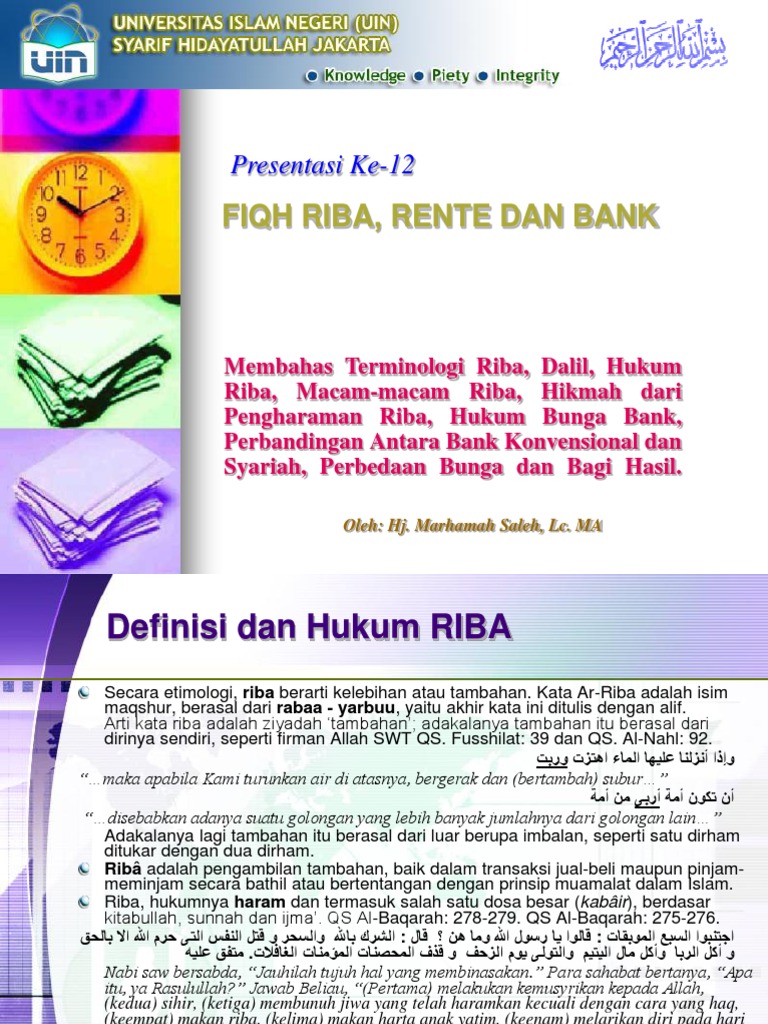 Mengenal Riba dan Kaitannya dengan Bunga Bank - Cermati Jun 21, 2016 · Mengenal Riba dan Kaitannya dengan Bunga Bank. Edited by Cermati.com 21 Juni 2016. Dalam konteks syariah (hukum Islam) memakan riba termasuk salah satu dosa besar. Namun pada praktiknya masih banyak masyarakat yang bingung dengan praktik riba tersebut dalam kehidupan sehari-hari khususnya yang terkait dengan transaksi perbankan. PERBEDAAN RIBA DENGAN BUNGA - SlideShare Mar 22, 2014 · PERBEDAAN RIBA DENGAN BUNGA. 1. RIBA (USURY) Adalah pengambilan bunga atas pinjaman uang dengan berlebihan, sehingga cenderung mengarah kepada eksploitasi atau pemerasan. BUNGA (INTEREST) Adalah tanggungan pada pinjaman uang,yang biasanya di nyatakan dengan prosentase dari uang yang dipinjamkan. 2. Riba Qard Riba Jahiliyah Riba fadhl Riba nasiah.