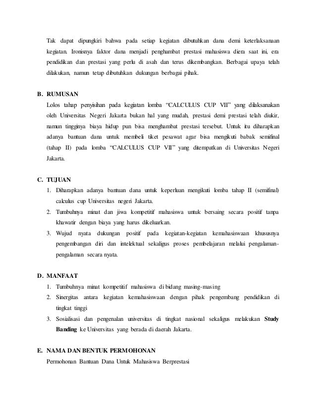 PDF Format Proposal Dan Lpj Permohonan Dana Lomba PERMOHONAN DANA LOMBA a. Aturan Format Proposal dan LPJ - Format tulisan verdana, font size 10 pt, spasi 1,5 - Pada bagian lampiran 1, 2, dan 3 dibuat pada halaman yang berbeda - Judul proposal yakni instansi pelaksana yang dicantumkan yakni instansi penyelenggara kegiatan lomba - Kop yang digunakan pada proposal yakni kop lembaga HM [TXT] Proposal Permohonan Dana Mengikuti Lomba Sepak Bola ... Proposal Permohonan Dana Mengikuti Lomba Sepak Bola. Proposal Permohonan Dana Mengikuti Lomba Sepak Bola. Click the start the download. DOWNLOAD TXT . Report this file. Description weEWQE Account 207.46.13.3. Login. Register. Search. Search. About Us We believe everything in the internet must be free. So this tool was designed for free download ... Contoh Surat Permohonan Dana Kegiatan Lomba | Unit.my.id Untuk mengatasi masalah sumber dana ini dapat dilakukan dengan iuran antaranggota. Surat permohonan bantuan proposal jalan sehat dan bazar. Rincian Formasi Cpns Pali 2019 Pdf Dan Persyaratan Pendaftaran Guru Penjara Riwayat Hidup Berbagai kegiatan diselenggarakan untuk menyemarakkannya. Contoh surat permohonan dana kegiatan lomba. Contoh Surat Permohonan Dana Donatur Kegiatan IPNU.