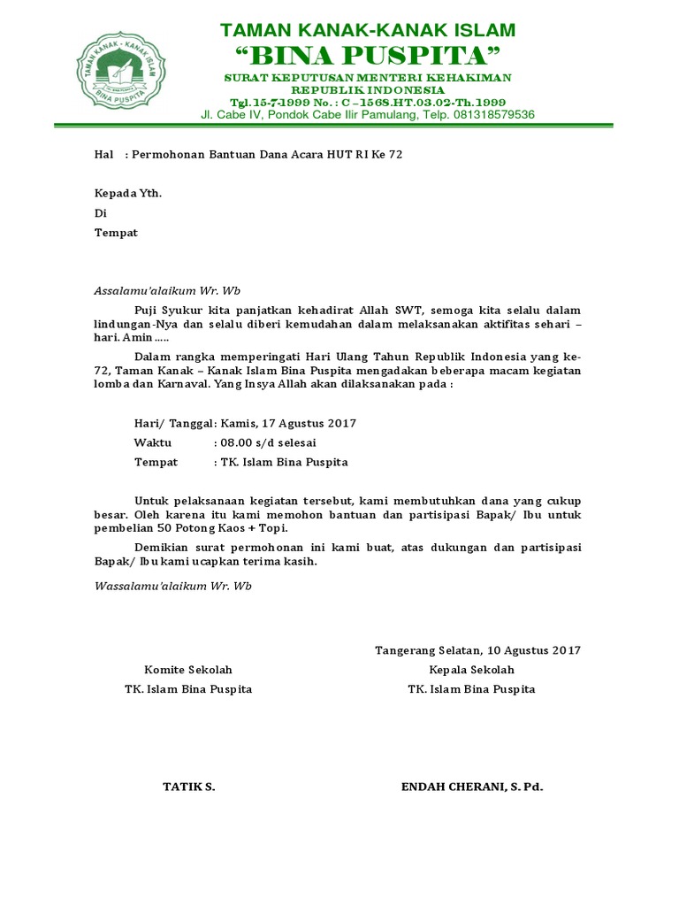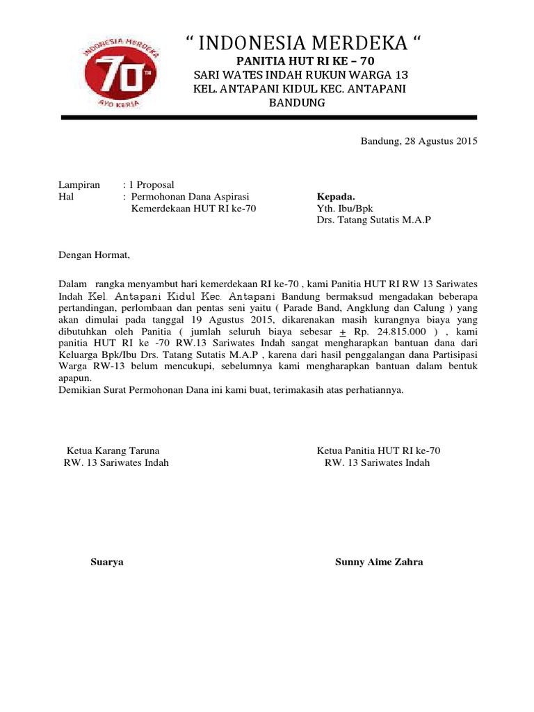 Contoh Surat Permohonan Dana, Izin, Bantuan, Kerja Dll +Lengkap Contoh Surat Permohonan - Surat dibutuhkan sebagai sarana atau alat komunikasi untuk menyampaikan pesan jarak jauh. Namun, ada beberapa fungsi surat yang tidak hanya digunakan sebagai alat penyampai pesan untuk berinteraksi dalam hubungan informal saja. Contoh Proposal Kegiatan 17 Agustus Karang Taruna Tunas Muda Hal : Permohonan Bantuan Dana Yang Tehormat. Kegiatan HUT RI Bapak/Ibu/Saudara. Di Tempat. I.1 LATAR BELAKANG. Tema HUT RI ke-71: "Gelora semangat Proklamasi 17 Agustus 1945, Satukan Bangsa, Satukan Cita, Untuk Indonesia Satu Indonesia makmur Sentosa". Permohonan Dana Perusahaan 17 Agustus | PDF contoh surat permohonan dana by sunny8aime8zahra. Flag for inappropriate content. Download now. SaveSave Permohonan Dana Perusahaan 17 Agustus For Later. Bandung, 28 Agustus 2015. Lampiran : 1 Proposal Hal : Permohonan Dana Aspirasi Kepada. Contoh Surat Edaran 17 Agustus Contoh surat permohonan bantuan dana peringatan hut ri 17 agustus contoh surat permohonan bantuan dana 17 agustus berhubung sebentar lagi kita akan Contoh Surat Permohonan Bantuan Dana Kegiatan 17 Agustus Gudang. Doc Surat Edaran S Kurniawan Academia Edu.