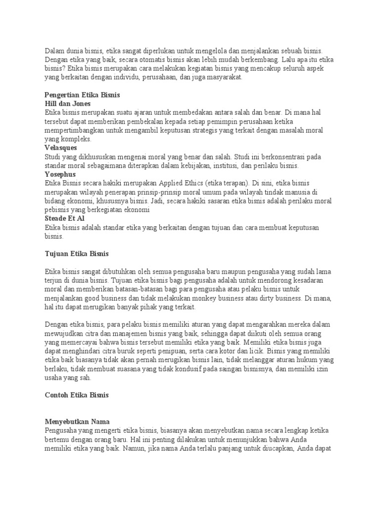 √ Pengertian Etika Bisnis, Tujuan dan Contohnya | GreatDay ... Dalam dunia bisnis, etika menjadi elemen penting yang harus diperhatikan, dan mencakup dalam berbagai aspek baik itu individu, perusahaan, maupun masyarakat. Hal ini perlu diperhatikan sebagaimana nantinya akan berguna untuk banyak pihak. Selain itu etika yang baik akan membantu Anda dalam mengembangkan bisnis dengan lebih mudah.