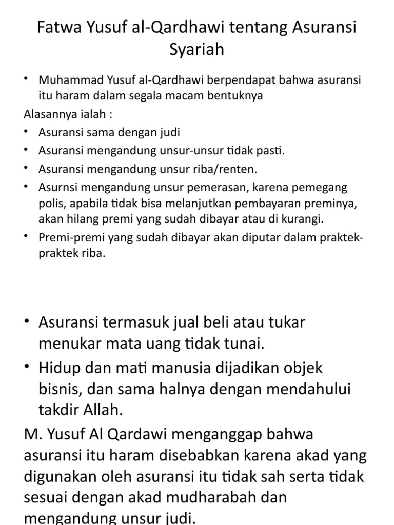 Asuransi Dalam Islam - Boleh atau Tidak? - DalamIslam.com Asuransi merupakan hal haram apapun wujudnya termasuk asuransi jiwa. Pendapat tersebut telah dikemukakan oleh Sayyid Sabiq Abdullah al-Qalqii Yusuf Qardhawi dan juga Muhammad Bakhil al-Muth'i. Sementara beberapa alasan mengapa asuransi dikatakan haram adalah sebagai berikut: Asuransi terkandung unsur yang belum pasti.