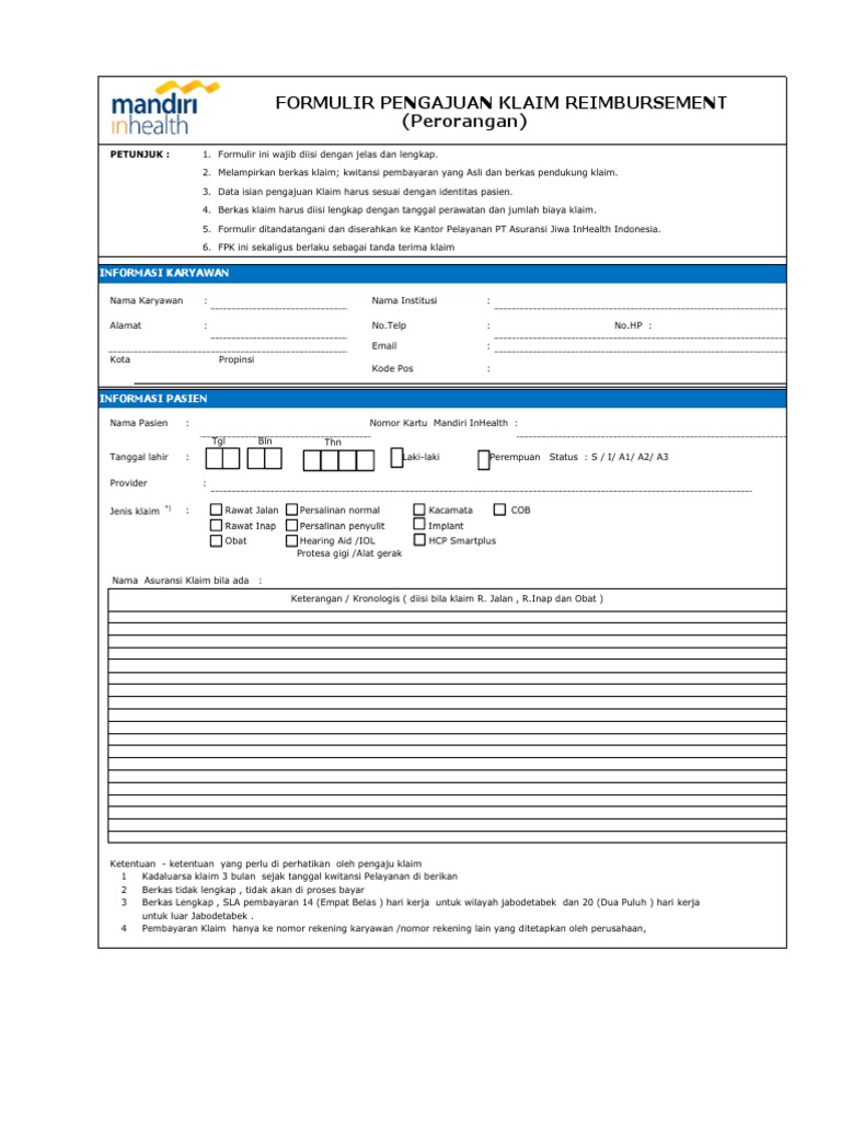 Pt. asuransi jiwa inhealth indonesia: persyaratan pengajuan klaim... PERSYARATAN PENGAJUAN KLAIM I.KLAIM PERORANGAN 1.Mengisi formulir Pengajuan Klaim (FPK) 2.Foto Copy Kartu Peserta (Kartu InHealth) 3.Kwitansi asli • Jika nilai nominal lebih dari Rp 250.000,-maka menggunakan materai Rp.3.000,- • Jika nilai nominal lebih dari Rp 1,000.000...