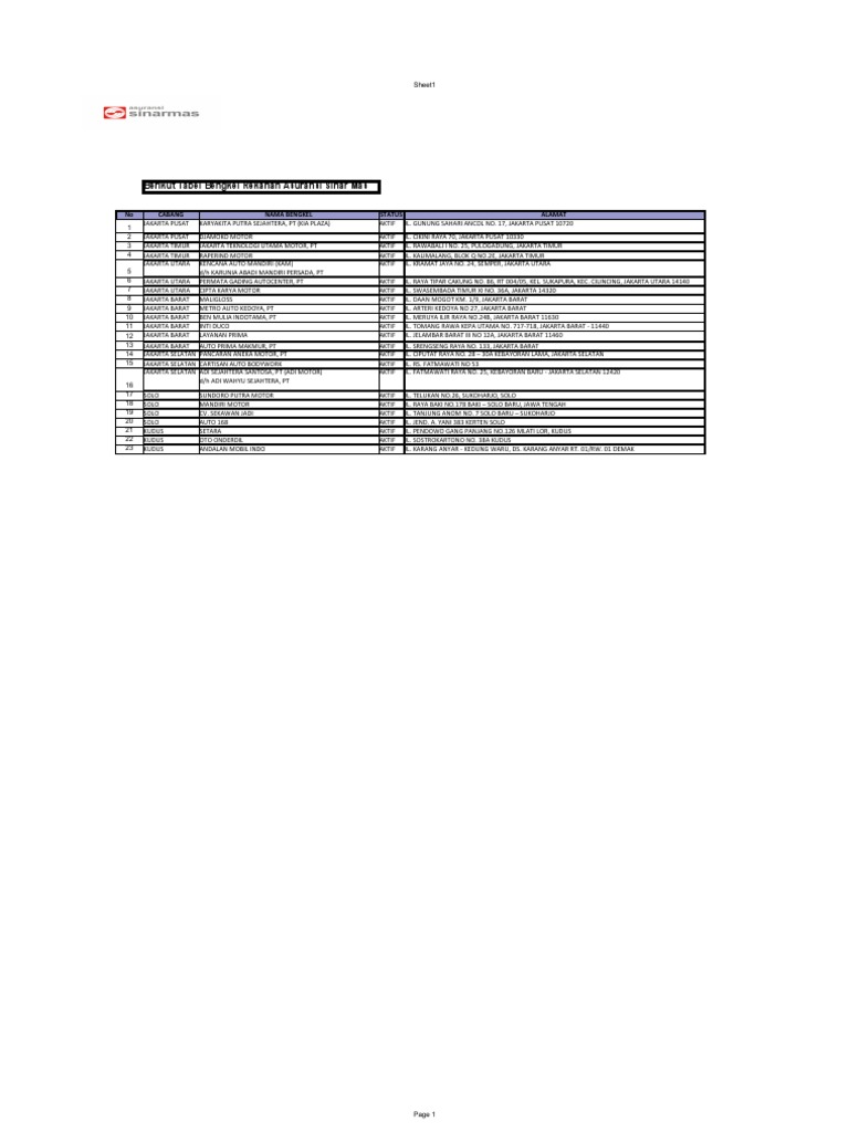 Asuransi Mobil Sinarmas - Premi, Cara Klaim, dan Daftar ... Asuransi kendaraan Sinarmas memiliki jangkauan bengkel rekanan yang luas di kota-kota besar, mulai dari wilayah DKI Jakarta hingga Jawa Timur. Ini daftar lengkapnya. Bengkel rekanan asuransi kendaraan Sinarmas di DKI Jakarta Layanan Prima: Jl Jelambar Barat III No 12A, Jakarta Barat (021) 5665930/31