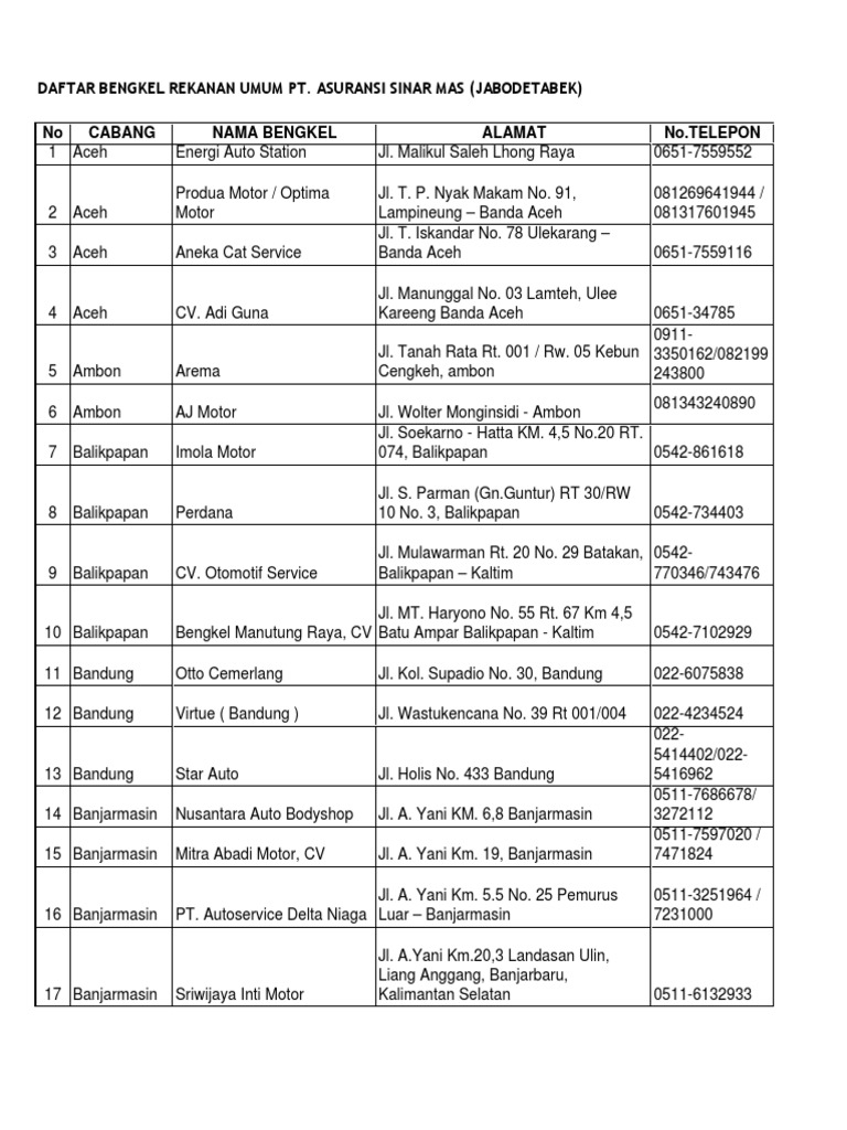 PDF No CABANG NAMA BENGKEL ALAMAT No.TELEPON - asuransiku DAFTAR BENGKEL REKANAN UMUM PT. ASURANSI SINAR MAS (JABODETABEK) 10 Balikpapan Bengkel Manutung Raya, CV Jl. MT. Haryono No. 55 Rt. 67 Km 4,5 Batu Ampar Balikpapan - Kaltim 0542-7102929 11 Bandung Otto Cemerlang Jl. Kol. Supadio No. 30, Bandung 022-6075838 12 Bandung Virtue ( Bandung ) Jl. Wastukencana No. 39 Rt 001/004 022-4234524