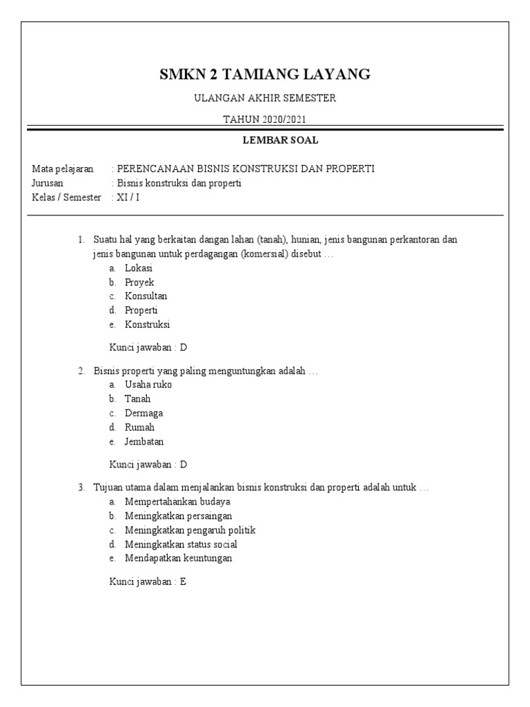 Teknik Bisnis Konstruksi Dan Properti - SMK Negeri 1 Singosari Tujuan Kompetensi Keahlian Teknik Bisnis Konstruksi Dan Properti. Tujuan Kompetensi Keahlian Teknik Bisnis Konstruksi Dan Properti secara umum mengacu pada isi Undang Undang Sistem Pendidikan Nasional (UU SPN) pasal 3 mengenai Tujuan Pendidikan Nasional dan penjelasan pasal 15 yang menyebutkan bahwa pendidikan kejuruan merupakan pendidikan menengah yang mempersiapkan peserta didik terutama ... Bisnis Konstruksi dan Properti, Begini Cara Mudah ... Usaha bisnis konstruksi dan properti memang menguntungkan selain banyak orang yang membutuhkan dan menginginkan, angkanya setiap tahun akan terus bertambah. Tetapi, perhatikan perencanaan. Salah satu modal penting dalam membangun usaha ini. Selanjutnya, adalah usaha keras untuk bisa mewujudkannya. Ide Bisnis konstruksi, properti