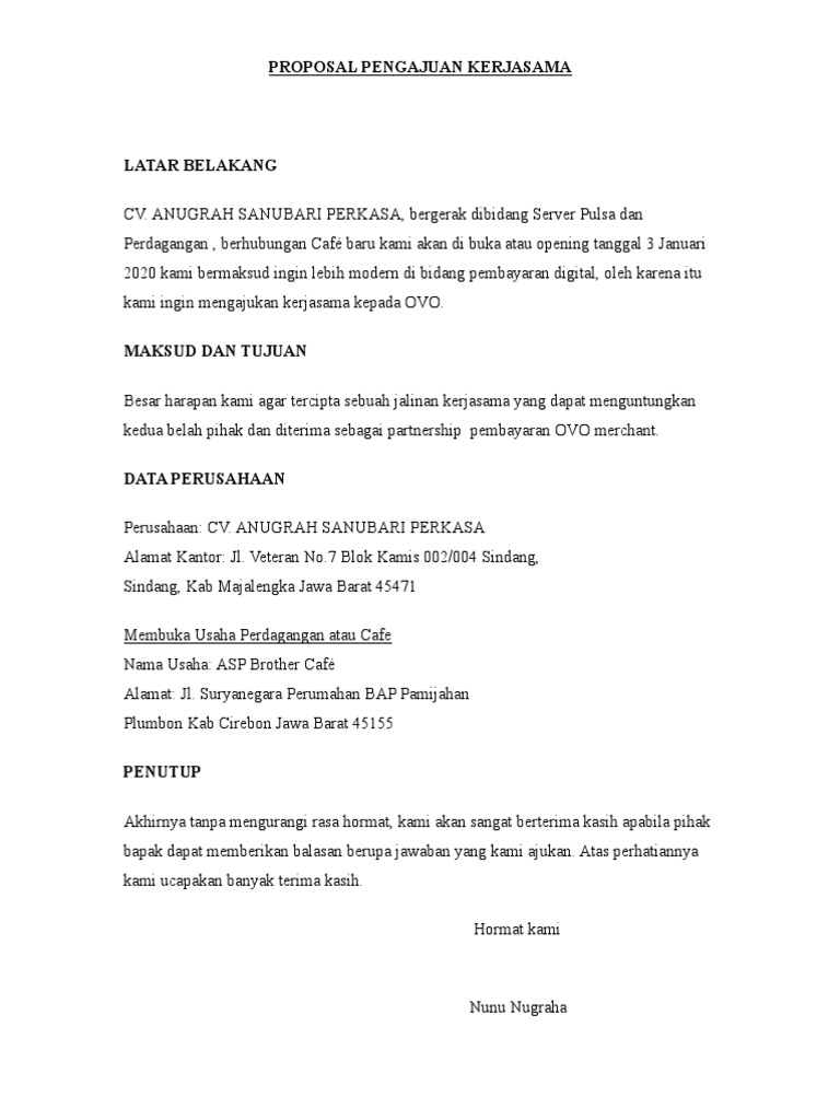 Contoh Proposal Pengajuan Kerjasama Dengan Bank - Berbagi ... 16 Contoh Surat Permohonan Kerjasama Kegiatan Perusahaan. Itulah yang dapat admin bagikan mengenai contoh proposal pengajuan kerjasama dengan bank. Admin blog Berbagi Contoh Proposal 2019 juga mengumpulkan gambar-gambar lainnya terkait contoh proposal pengajuan kerjasama dengan bank dibawah ini. 15 Contoh Surat Penawaran Kerjasama Barang Jasa Dan. Contoh Proposal Proyek yang Benar (Format dan Cara Membuat) Contoh Proposal Proyek, Format, dan Cara Membuatnya. Proposal proyek adalah istilah lain yang dipakai untuk membedakan proposal yang ditulis untuk bisnis atau penelitian. Meski demikian, dalam proposal proyek kecederungannya adalah menawarkan kegiatan yang lebih bersifat sosial, non profit, dan biasanya masuk dalam program program eksklusif ...