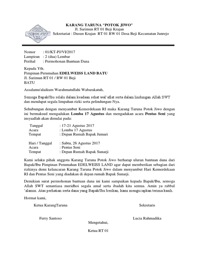 Contoh surat permohonan bantuan dana 17 agustus. Contoh Surat Permohonan Dana Untuk Kegiatan 17 Agustus ... Admin blog Kumpulan Surat Penting juga mengumpulkan gambar-gambar lainnya terkait contoh surat permohonan dana untuk kegiatan 17 agustus dibawah ini. Surat Permohonan Bantuan Proposal Jalan Sehat Dan Bazar Memperingat. 16 Contoh Surat Permohonan Dana Kegiatan Dan Bantuan Contoh Surat. Proposal Lomba Phbn. Undang-Undang Nomor 17 Tahun 2000 | Direktorat Jenderal Pajak Aug 02, 2000 · Contoh : Apabila Surat Pemberitahuan Tahunan Pajak Penghasilan disampaikan oleh Wajib Pajak pada bulan Maret 2001, maka besarnya angsuran pajak yang harus dibayar Wajib Pajak untuk bulan Januari dan Pebruari 2001 adalah sebesar angsuran pajak bulan Desember 2000, misalnya sebesar Rp 1.000.000,00. Contoh Surat Bantuan Dana Karang Taruna - Contoh Surat Format Gambar Contoh Surat Bantuan Dana Karang Taruna yang Benar 2019. Contoh Surat Bantuan Dana Karang Taruna have an image associated with the other.Contoh Surat Bantuan Dana Karang Taruna It also will feature a picture of a sort that may be seen in the gallery of Contoh Surat Bantuan Dana Karang Taruna. The collection that consisting of chosen picture and the best among others. Contoh Surat Permohonan Bantuan Dana Kegiatan 17 Agustus Contoh Surat Permohonan Bantuan Dana Kegiatan 17 Agustus Contoh proposal Agustusan Untuk pembuatan proposal dalam sebuah acara haruslah lengkap maksud tujuan latar belakang serta isi kegiatan.