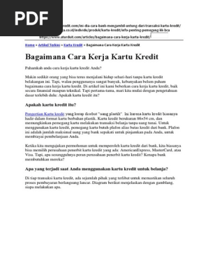 Pengertian Kartu Kredit Dan Cara Kerjanya! - Kabarduit Kartu kredit di nilai lebih efektif dan efisien di bandingkan dengan sistem pembayaran lainnya, sehingga APMK ini lebih di gemari oleh kebanyakan orang. Diterbitkannya kartu kredit di dasarkan atas perjanjian yang di buat oleh pihak bank penerbit dan pengguna kartu. Pengertian Kartu Kredit, Fungsi, Jenis, Sistem, Keuntungan ... Sistem Kerja Kartu Kredit. Ketika dilakukan pengajuan untuk menjadi pemakai kartu kredit, maka hal pertama yang harus dilakukan ialah mengajukan permohonan kartu kredit pada pihak bank yang mngeluarkan kartu kredit tersebut. Hal itu bisa dilakukan dengan mengunungi bank serta membawa persyaratan yang diminta oleh bank. √ Pengertian Kartu Kredit, Fungsi, Jenis, Sistem Kerja ... Sistem Kerja Kartu Kredit Pada saat pengajuan untuk menjadi pengguna kartu kredit, maka yang harus dilakukan pertama kali adlaah mengajukan permohonan kartu kredit kepada pihak bank yang menerbitkan kartu kredit. Hal tersebit dapat dilakukan dengan cara datang ke bank dan membawa persyaratan yang diminta oleh pihak bank.