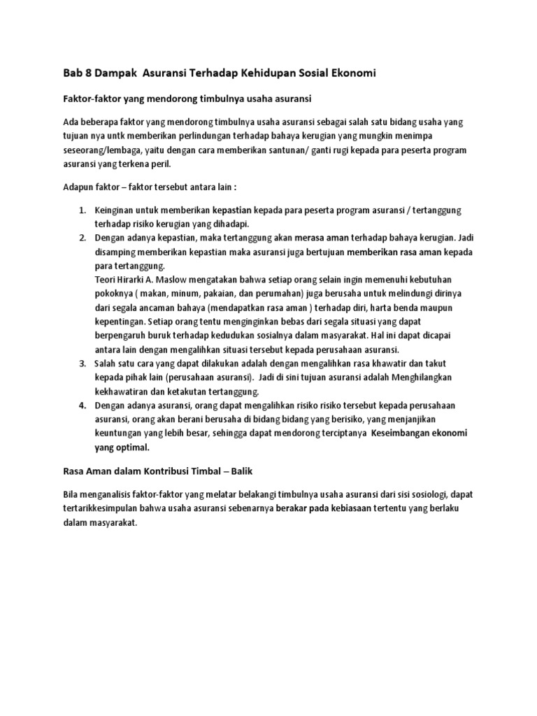 Bab 8 Dampak Asuransi Terhadap Kehidupan Sosial Ekonomi ... Bab 8 Dampak Asuransi Terhadap Kehidupan Sosial Ekonomi Faktor-faktor yang mendorong timbulnya usaha asuransi Ada beberapa faktor yang mendorong timbulnya usaha asuransi sebagai salah satu bidang usaha yangtujuan nya untk memberikan perlindungan terhadap bahaya kerugian yang mungkin menimpaseseorang/lembaga, yaitu dengan cara memberikan santunan/ ganti rugi kepada para peserta programasuransi ...