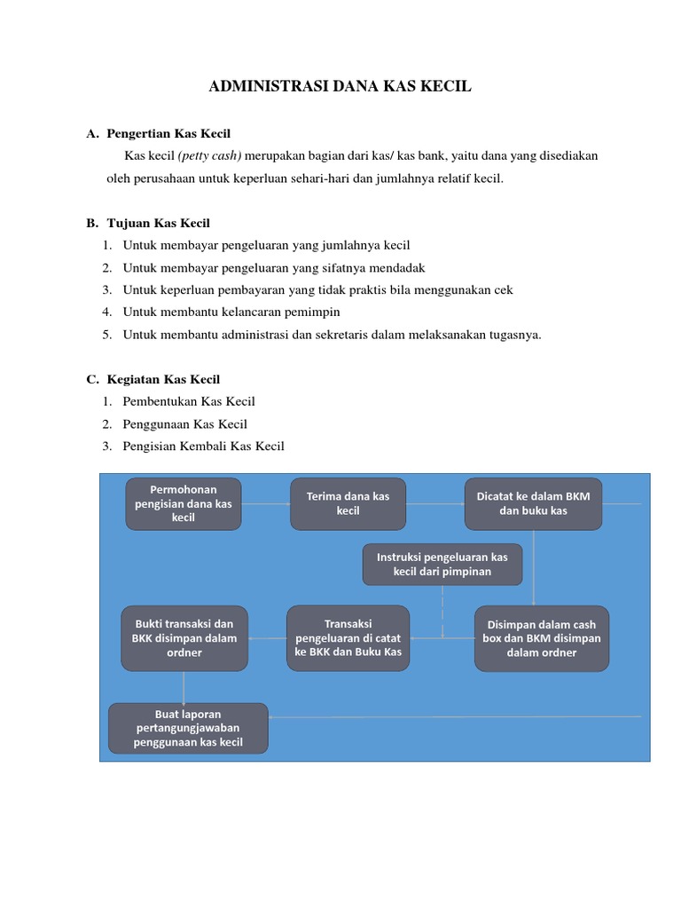 Kas Kecil: Pengertian - Cara membuat dan Contohnya Akuntansi Menyatakan bahwa dana kas kecil ialah dana yang berupa pembayaran, tidak menggunakan cek sebagai alat pembayaran, akan tetapi menggunakan uang tunai. Pengertian Secara Umum Secara umum kas kecil atau Petty Cash adalah sejumlah uang tunai yang disediakan untuk membayar keperluan atasan atau pimpinan atau bagian dikantor yang jumlahnya relatif kecil. Kas Kecil: Pengertian, Pembentukan, Fungsi, Dan Metode Kas ... Pengertian kas kecil ialah sejumlah dana yang telah dibentuk oleh perusahaan untuk membiayai pengeluaran operasional yang segera dibayarkan dengan jumlah relatif kecil, jadi tidak ekonomis bila dibayar melalui cek atau giro. Cara Pembentukan Kas Kecil