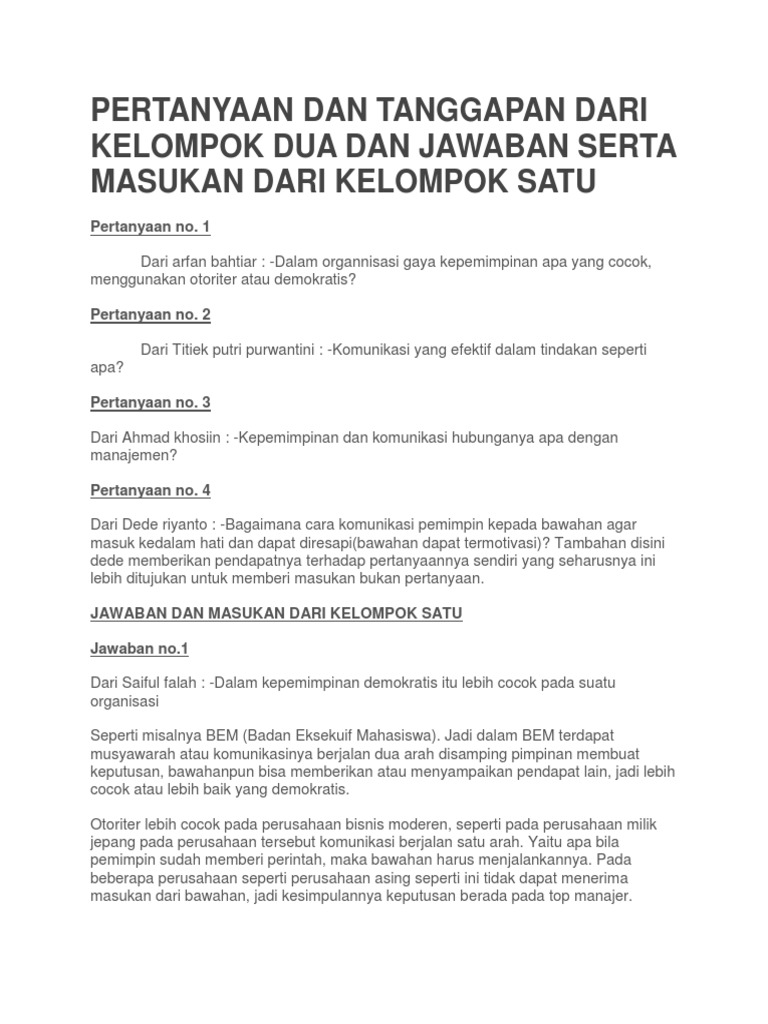 15 pertanyaan komunikasi bisnis Quiz - Quizizz Bagaimana bisnis menggunakan media sosial, kecuali . 15 pertanyaan komunikasi bisnis DRAFT. University. 0 times. 0% average accuracy. a few seconds ago. permatakemuliaan_67173. 0. Save. Edit. Edit. 15 pertanyaan komunikasi bisnis DRAFT. a few seconds ago. by permatakemuliaan_67173. Played 0 times. 0. Paper Manajemen Strategik Implemen Strategi | PDF - Scribd Nov 21, 2017 · Paper Manajemen Strategik Implemen Strategi by sigit6wahyudhi. MANAJEMEN STRATEGIK. EMA 412 B4. PROSES IMPLEMENTASI STRATEGI. Oleh Kelompok 4 Tebuana Agung Putra NIM. 1506305063 Putu Nadya Pradnyani Dewi NIM. 1506305072 Gede Diatmika Putra NIM. 1506305077 Gentha Putri Wardana NIM. 1506305095 P. Sigit Wahyudhi NIM. … Kumpulan pertanyaan tentang Komunikasi | Stagustaf 9. ( Pertanyaan berikutnya tentang komunikasi?) Silahkan ditambahkan point tentang komunikasi disini sesuai dengan pengalaman masing-masing! 🙂. Banyak banget sih yang bisa dibahas tentang komunikasi, tapi sedikit-sedikit deh ya. Semoga ini bisa kita manfaatkan utk memperbaiki komunikasi kita sebelum menjadi seorang Public Speaker yg diinginkan. Pertanyaan Dan Tanggapan Dari Kelompok Dua Dan Jawaban ... Pertanyaan no. 1 Dari arfan bahtiar : -Dalam organnisasi gaya kepemimpinan apa yang cocok, menggunakan otoriter atau demokratis? Pertanyaan no. 2 Dari Titiek putri purwantini : -Komunikasi yang efektif dalam tindakan seperti apa? Pertanyaan no. 3 Dari Ahmad khosiin : -Kepemimpinan dan komunikasi hubunganya apa dengan manajemen?
