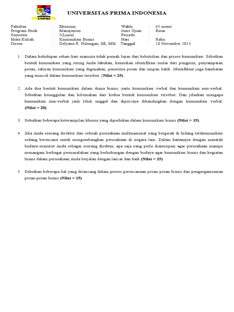 Soal Jawab Komunikasi Bisnis | PDF - Scribd SOAL-SOAL BAB 1 s/d BAB 7 · 1. Apa yang dimaksud dengan budaya dan subbudaya? · 2. Jelaskan pentingnya komunikasi lintas budaya dalam bisnis! · 3. · 4. Bagaimana ... Komunikasi Bisnis 1 - Soal UT Sebagai awal bahasan dalam komunikasi bisnis, maka akan dibahas antara lain bentuk dasar komunikasi yang mencakup komunikasi verbal dan nonverbal, proses ... 42 pertanyaan tentang komunikasi bisnis - Dunia Cuan May 12, 2019 · Pertanyaan tentang komunikasi bisnis. Komunikasi bisnis materi unsur proses fungsi manfaat bentuk dan contoh dosenpendidikancom secara harfiah komunikasi ialah interaksi antara dua orang atau lebih untuk menyampaikan suatu pesan atau informasi komunikasi secara umum bertujuan untuk memberikan pengetahuan kepada orang lain.