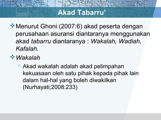 Asuransi Syariah: Pengertian, Jenis, Tujuan, Produk ... Adapun beberapa akad yang sering digunakan dalam asuransi berbasis syariah antara lain: 1. Akad Tabarru' Akad yang dimaksud adalah setiap peserta akan memberikan hibah berupa premi melalui dana tabarru' yang akan digunakan untuk menolong peserta lain yang terkena musibah.