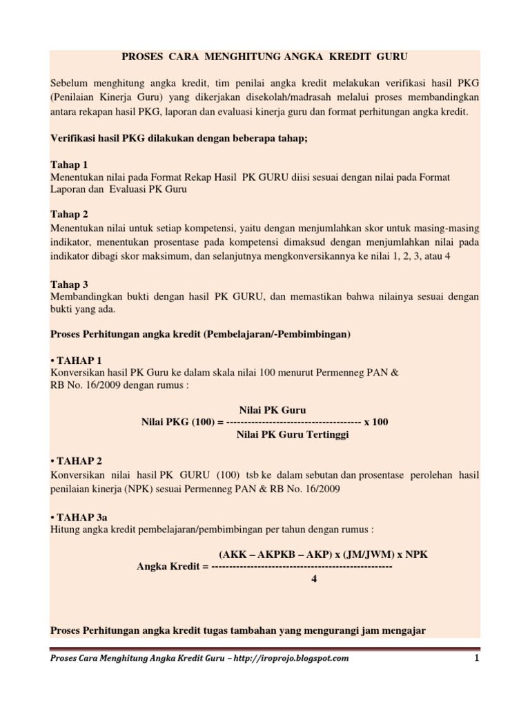 Menghitung angka kredit_pkg - SlideShare Cara Menghitung Angka Kredit Guru Mapel Tahap menghitung Angka Kredit Guru: Contoh Penghitungan: Setelah melalui Proses Penilaian Kinerja Guru dengan menggunakan Instrumen Penilaian di atas (lih poin C), Ibu Natalia Cemara, S.Ag, guru mapel agama Katolik Golongan III/b pada tahun pelajaran 2012‐2013 mendapatkan nilai sebesar 50.