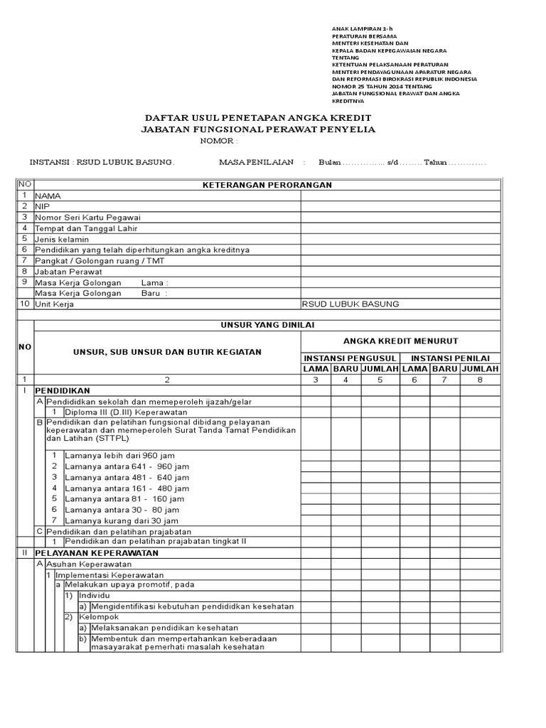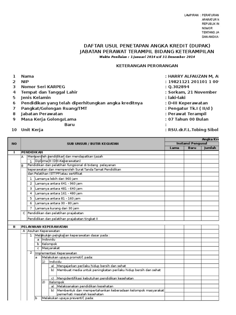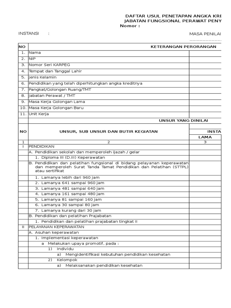 FORMAT DUPAK PERAWAT AHLI MUDA - Academia.edu format daftar usulan penetapan angka kredit perawat pendidikan S1 keperawatan Ners jabatan fungsional perawat ahli muda Pangkat golongan IIIc/IIId. bersadarkan perbersama Menkes dan Kepala BKN tahun 2015