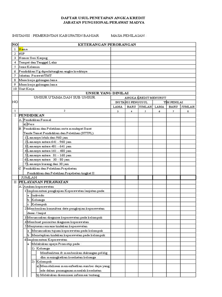 Blangko angka kredit perawat. DUPAK (Daftar Usulan Penetapan Angka Kredit) Bidan ... Simple Man. View all posts by herodessolution →. This entry was posted in Uncategorized. Bookmark the permalink . ← DUPAK (Daftar Usulan Penetapan Angka Kredit) Bidan. DUPAK (Daftar Usulan Penetapan Angka Kredit) Perawat Gigi →. PDF Tata Cara Penyusunan Daftar Usulan Penilaian Angka Kredit ... Komposisi Angka Kredit Kumulatif ≥80 ≤20 ≥60 ≤10 Angka Kredit Beda Jenjang Mengerjakan butir kegiatan milik jabatan 1 jenjang di atas jenjang jabatannya Mengerjakan butir kegiatan milik jabatan 1 jenjang di bawah jenjang jabatannya 100% 80% AK Pengembangan Profesi 6 AK 12 AK 4 AK 8 AK 2 AK Blangko Dupak Perawat Trampil - scribd.com Blangko Angka Kredit Perawat. SKP perawat puskesmas. Dupak Perawat Baru 2014. Contoh Angka Kredit Untuk Perawat. Angka Kredit Perawat AHLI.xls. Aplikasi Dupak Perawat Ahli 1-2. Skp Ppk Perawat Mahir. Skp Perawat Pelaksana Lanjutan. Form Panduan Pengisian Dupak Perawat. Buku Catatan Perawat. Contoh Menghitung Angka Kredit (PAK ... - rinosafrizal.com Angka Kredit berdasarkan Penilaian Kinerja Ketua Program Keahlian 5.1 Rumus menghitung AK dari Penilaian Kinerja Ketua Program Keahlian. Instrumen Penilaian Kinerja Ketua Program Keahlian, terdiri atas 8 kompetensi yang dijabarkan dalam beberapa indikator dengan jumlah skor maksimal 32. Instrumen PK Ketua Program Keahlian selanjutnya dikonversi ...