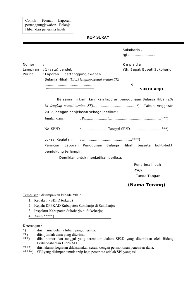Contoh Laporan Pertanggungjawaban Penggunaan Dana Hibah Masjid Itulah yang dapat kami bagikan terkait contoh laporan pertanggungjawaban penggunaan dana hibah masjid. Admin dari blog barisan contoh 2019 juga mengumpulkan gambar gambar lainnya terkait contoh laporan pertanggungjawaban penggunaan dana hibah masjid dibawah ini. Contoh proposal bantuan 1. KOP SURAT LEMBAGAPANITIAMASJID. 2015 Kepada Nomor.