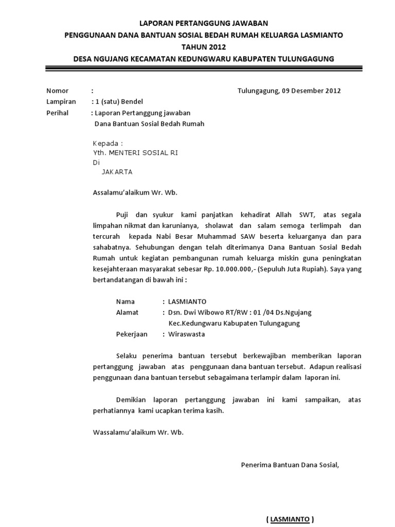 Contoh Laporan Pertanggungjawaban Bantuan Dana Sosial/hibah contoh laporan pertanggungjawaban dana bantuan sosial hibah adapun contoh lpj dana sosial hibah yang sudah biasa dipakai rehab sekolah madrasah masjid musalla dll bisa anda lihat berikut ini. 17pasal 21 ayat 1 peraturan menteri dalam negeri republik indonesia nomor 32 tahun 2011 tentang pedoman pemberian hibah dan bantuan sosial yang sersumber …