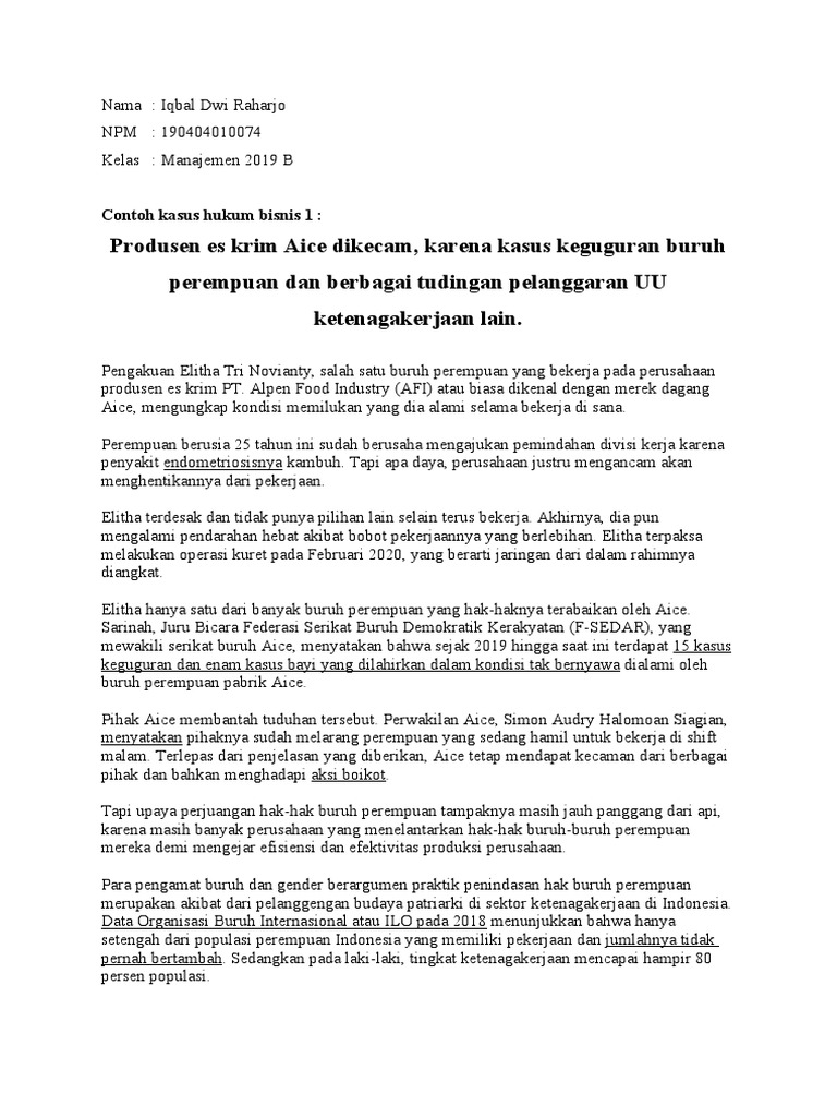 2 Contoh Kasus yang Melanggar Aspek Hukum dalam Bisnis Contoh Kasus Aspek Hukum dalam Studi Kelayakan Bisnis di Indonesia. Pelanggaran kasus hukum maupun etika dalam bisnis juga terjadi di sejumlah perusahaan di dalam negeri. Salah satunya datang PT. Nabisco yang merupakan produsen dari makanan ringan yang sangat laris yang bermerk Oreo. Siapa yang tak suka dengan biskuit lezat ini?