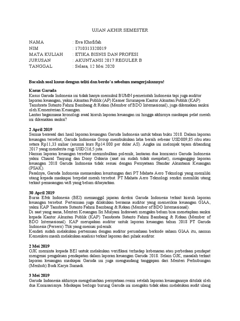 Garuda Terancam Pailit: Etika Bisnis Kasus Garuda ... Tahun 2019 Garuda Indonesia terkena kasus etika bisnis. Diawali dengan penyelundupan onderdil salah satu merek kendaraan motor pada Pesawat A330 900NEO yang berakhir dengan pencabutan Direktur Utama Garuda Indonesia pada tahun 2019.