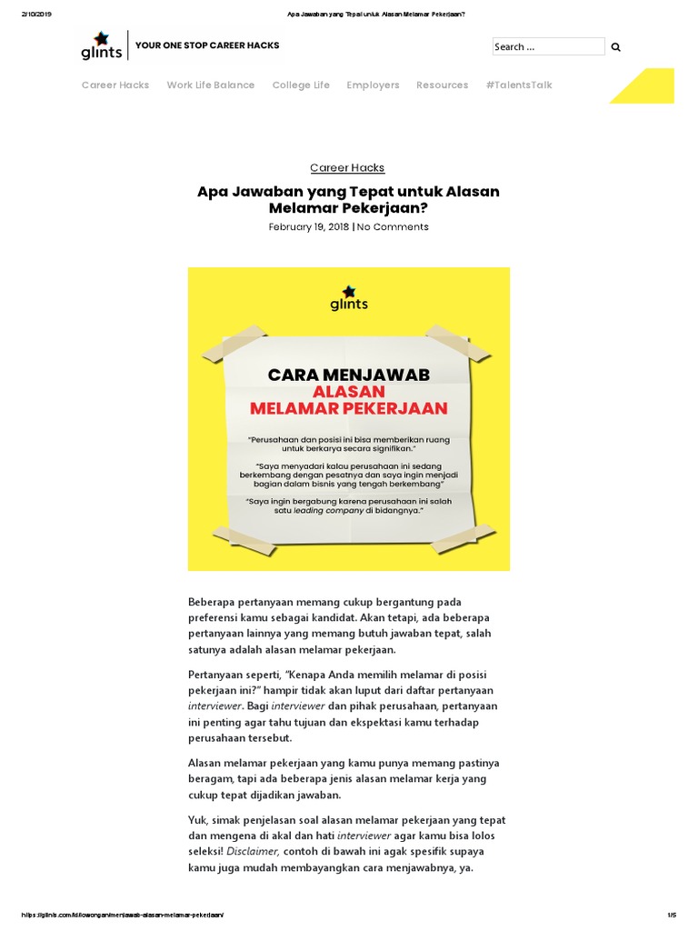 Alasan Melamar Pekerjaan di BUMN Saat Interview - Hidupcu.com Alasan Melamar Pekerjaan di BUMN. Pada dasarnya, alasan ingin bekerja di BUMN tak jauh dari beberapa hal berikut ini: Ingin mencari tantangan baru. Tempat kerja yang nyaman. Gaji yang ditawarkan cukup besar. Merasa bangga bekerja di BUMN karena saingan pendaftarnya banyak dan bergengsi. Jawaban Interview Kenapa Anda Mau Bekerja Di Bank Jadiberkah.com - Tahapan wawancara memang sering menjadi momok bagi pelamar, apalagi jika melamar di bank. Sebenarnya jawaban interview kenapa Anda mau bekerja di bank yang seperti apa supaya bisa diterima. Jangan sampai asal menjawab interview, yang mana bisa jadi menghambat jalan Anda untuk bekerja di bank tersebut.. Kalau pada saat interview saja Anda sudah gagal, lalu bagaimana dengan ...
