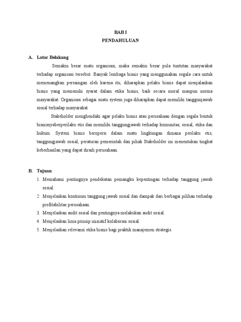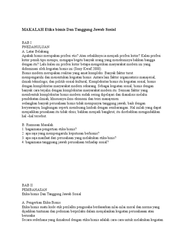 (DOC) MAKALAH ETIKA BISNIS DAN TANGGUNG JAWAB SOSIAL | Ade ... BAB II PEMBAHASAN 2.1 Pengertian Etika dan Tanggung Jawab Sosial Etika bisnis adalah suatu kode etik perilaku pengusaha berdasarkan nilai-nilai moral dan norma yang dijadikan tuntutan dan pedoman berperilaku dalam menjalankan kegiatan perusahaan atau berusaha.