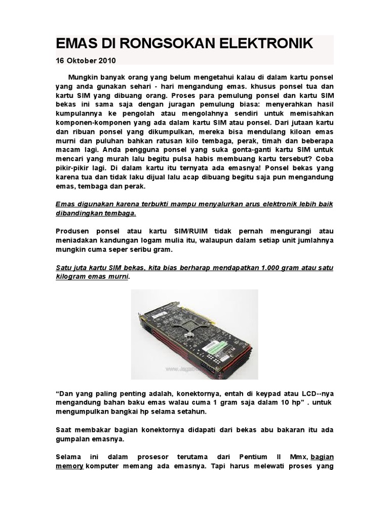 Cara memisahkan emas dari kartu sim. Cara Unreg Kartu Hilang, Mudah! Cara unreg kartu yang hilang bisa kamu lakukan dengan beberapa pilihan langkah-langkah yang mudah.. Mulai dari melalui fitur SMS, menghubungi layanan customer service, melalui fitur online dengan mengunjungi situs online dari provider seluler tersebut, atau dengan mendatangi gerai provider seluler terdekat secara langsung. Ada Emas dalam Ponsel dan SIM Card! - KOMPAS.com Proses para pemulung ponsel dan kartu SIM bekas ini sama saja dengan juragan pemulung biasa: menyerahkan hasil kumpulannya ke pengolah atau mengolahnya sendiri untuk memisahkan komponen-komponen yang ada dalam kartu SIM atau ponsel. Dari jutaan kartu dan ribuan ponsel yang dikumpulkan, mereka bisa mendulang kiloan emas murni dan puluhan bahkan ... Pedoman Umum Ejaan Bahasa Indonesia ... - Website Pendidikan Apr 10, 2020 · Download Pedoman Umum Ejaan Bahasa Indonesia (PUEBI) yang Disempurnakan ( EYD ) Terbaru-Sahabat pembaca, EYD yang terbaru yang digunakan sebagai pedoman pada tahun 2020 ini adalah buku pedoman EYD yang sesuai dengan Salinan Peraturan Menteri Pendidikan Dan Kebudayaan Republik Indonesia Nomor 50 Tahun 2015 Tentang Pedoman Umum Ejaan Bahasa Indonesia. SIM Card mengandung emas!! - tymask.ono Mari kita hitung peluang mendulang emas dari kartu SIM dari beberapa operator telekomunikasi yang ada di tanah air. Kita mulai dengan Telkomsel. Tahun ini pelanggannya sudah 52 juta. Dengan pertumbuhan pelanggan yang rata-rata 30% setahun, Telkomsel membutuhkan 200%, bahkan 300% kartu SIM dari jumlah pelanggan aktualnya. Menurut seorang ...